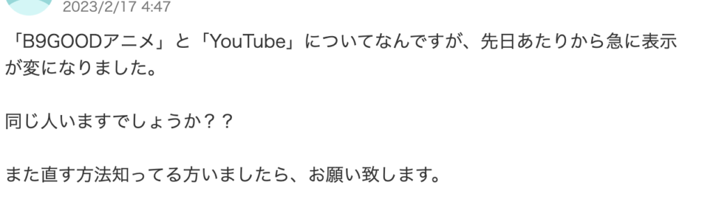 「「B9GOODアニメ」と「YouTube」についてなんですが、先日あたりから急に表示が変になりました。 同じ人いますでしょうか?? また直す方法知ってる方いましたら、お願い致します。」