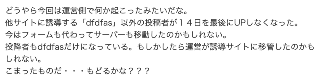 「どうやら今回は運営側で何か起こったみたいだな。 他サイトに誘導する「dfdfas」以外の投稿者が14日を最後にUPしなくなった。 今はフォームも代わってサーバーも移動したのかもしれない。 投降者もdfdfasだけになっている。もしかしたら運営が誘導サイトに移管したのかもしれない。」