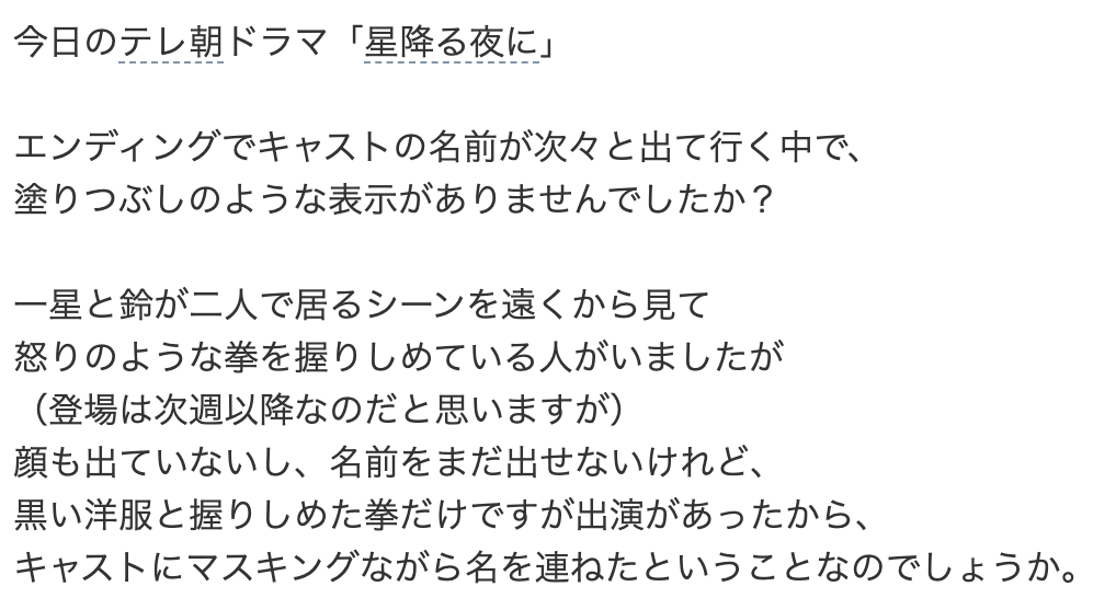 「星降る夜に」面白いよね。エンディングでキャスト名が塗りつぶされてるの新しいなと思った、シークレット誰だろうね〜。」