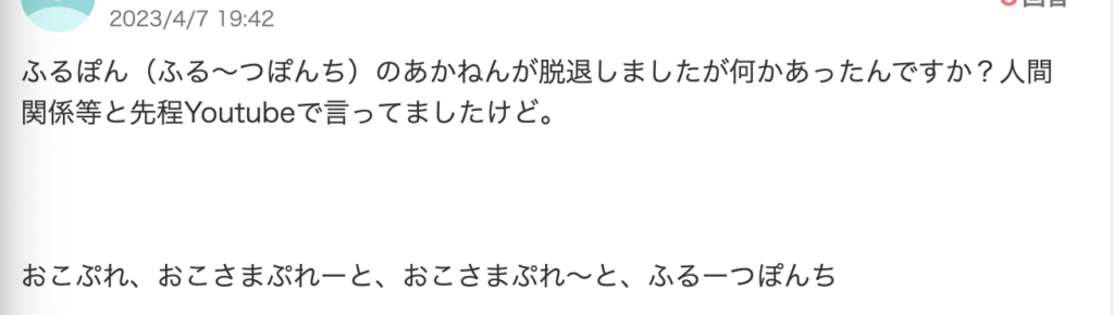 ふる〜つぽんち。あかねんさんの脱退理由に”人間関係”があります。