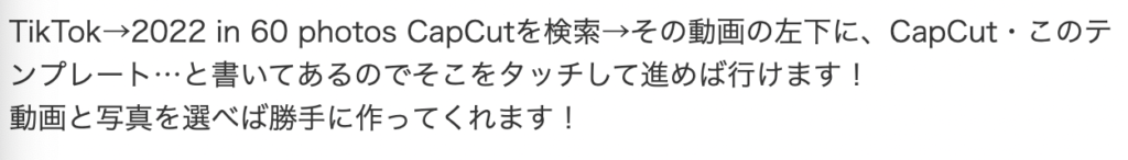 「TikTok→2022 in 60 photos CapCutを検索→その動画の左下に、CapCut・このテンプレート…と書いてあるのでそこをタッチして進めば行けます! 動画と写真を選べば勝手に作ってくれます!」