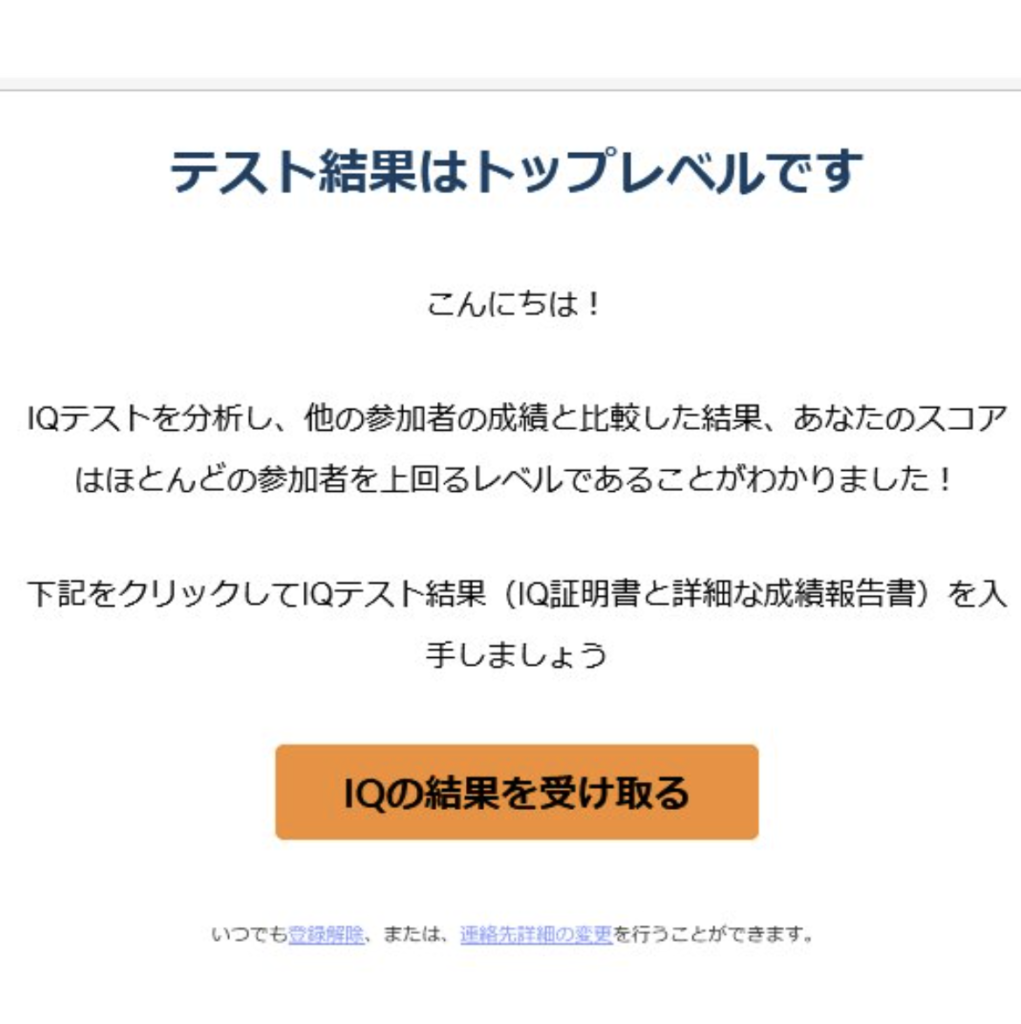 ネットのIQテストをやったら、メールであなたの知能は極めて高いという結果が出ました、詳しい結果を知りたければ有料と届いた。