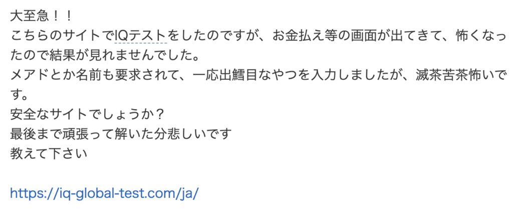 「こちらのサイトでIQテストをしたのですが、お金払え等の画面が出てきて、怖くなったので結果が見れませんでした。 メアドとか名前も要求されて、一応出鱈目なやつを入力しましたが、滅茶苦茶怖いです。 安全なサイトでしょうか?」
