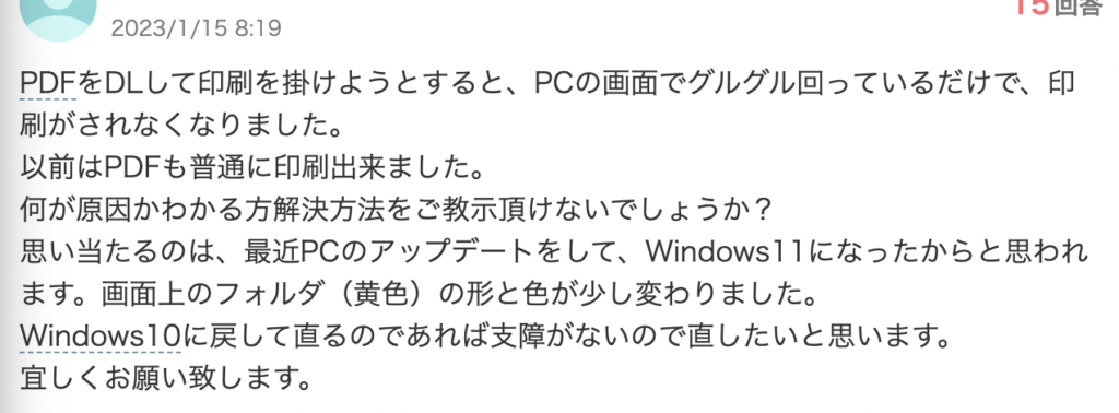 「PDFをDLして印刷を掛けようとすると、PCの画面でグルグル回っているだけで、印刷がされなくなりました。」