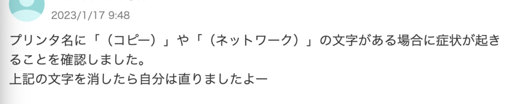 「プリンタ名に「(コピー)」や「(ネットワーク)」の文字がある場合に症状が起きることを確認しました。 上記の文字を消したら自分は直りましたよー」